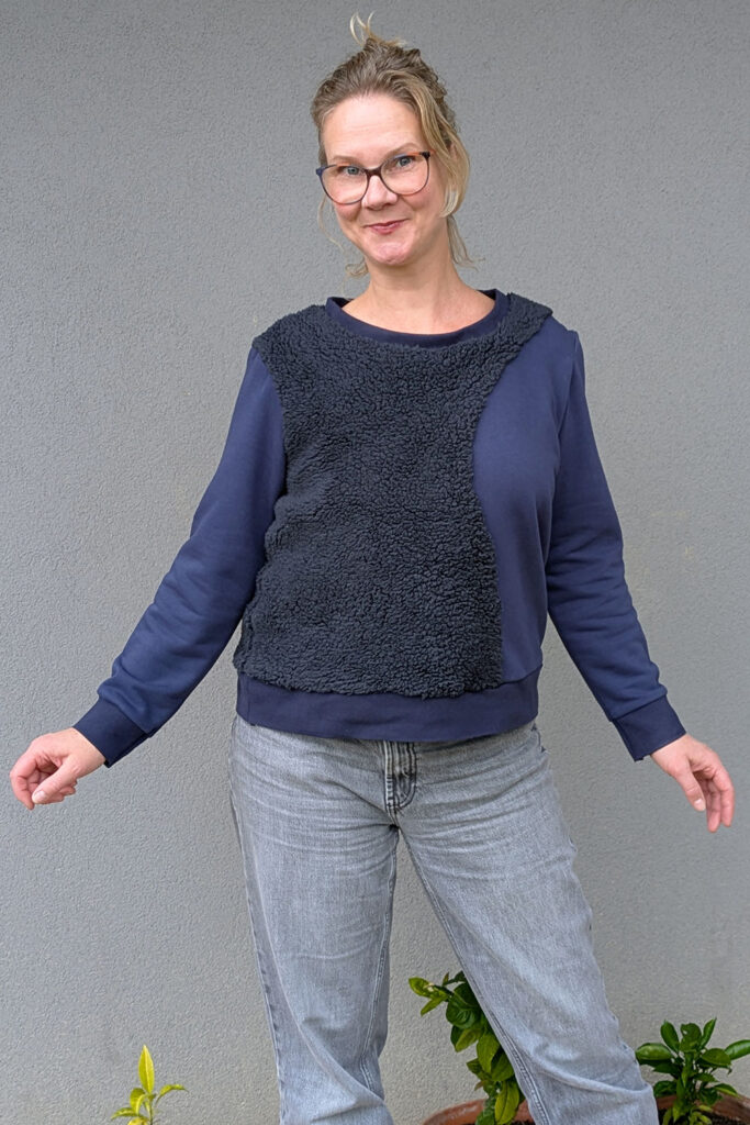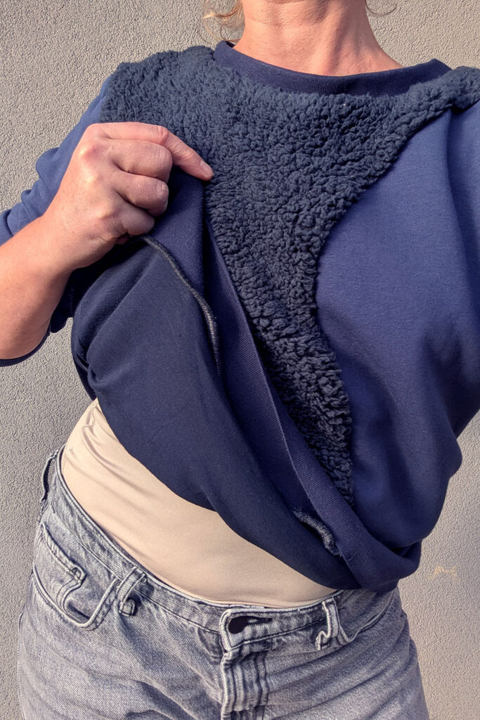 This cozy sweatshirt is made from three different fabrics. On the side where your breast is missing, we use a fabric with more volume, such as a fluffy teddy bear fabric or something padded. For the rest of the sweatshirt, we use a standard sweatshirt fabric (French terry or fleece). Additionally the sweatshirt has a lining from soft jersey fabric, for an extra comfy feeling on your skin. Not sure exactly what fabrics you need to buy? Ask for advice at your local fabric store, they’re happy to help. You can also go wild and choose a different color fabric for each part of the sweatshirt.
