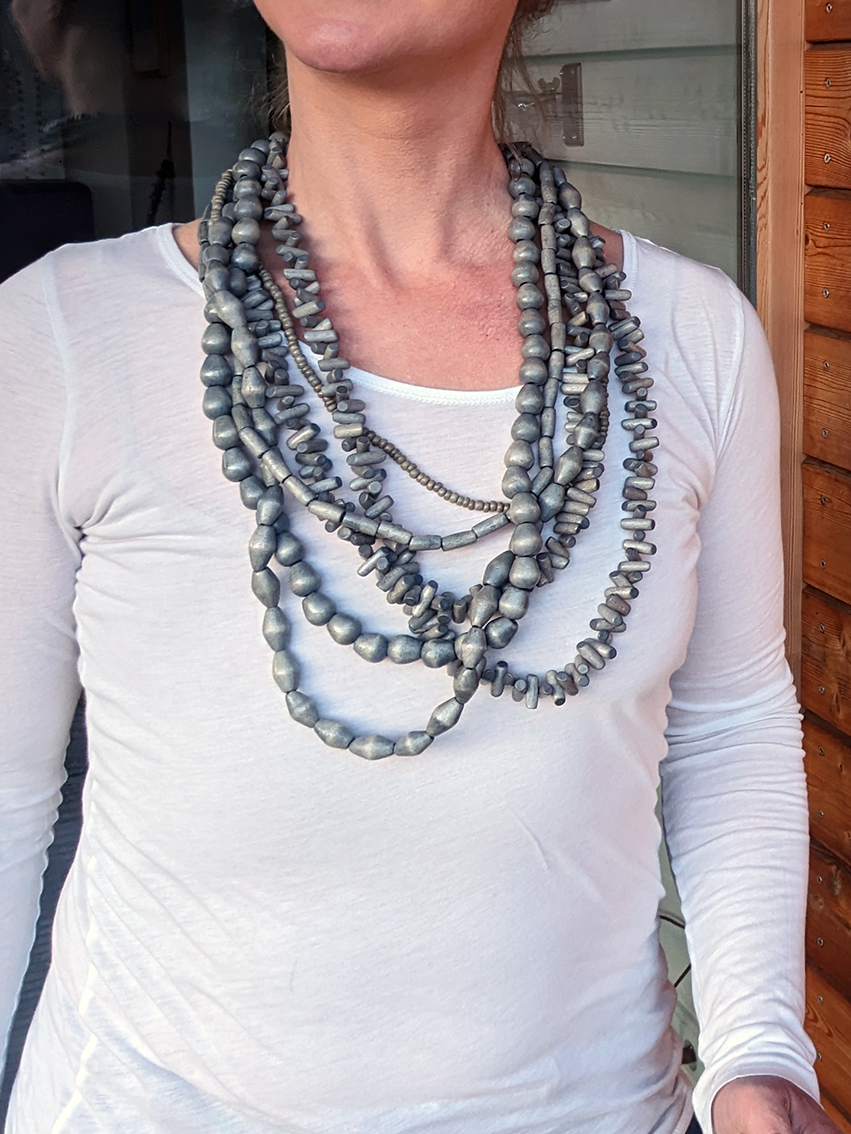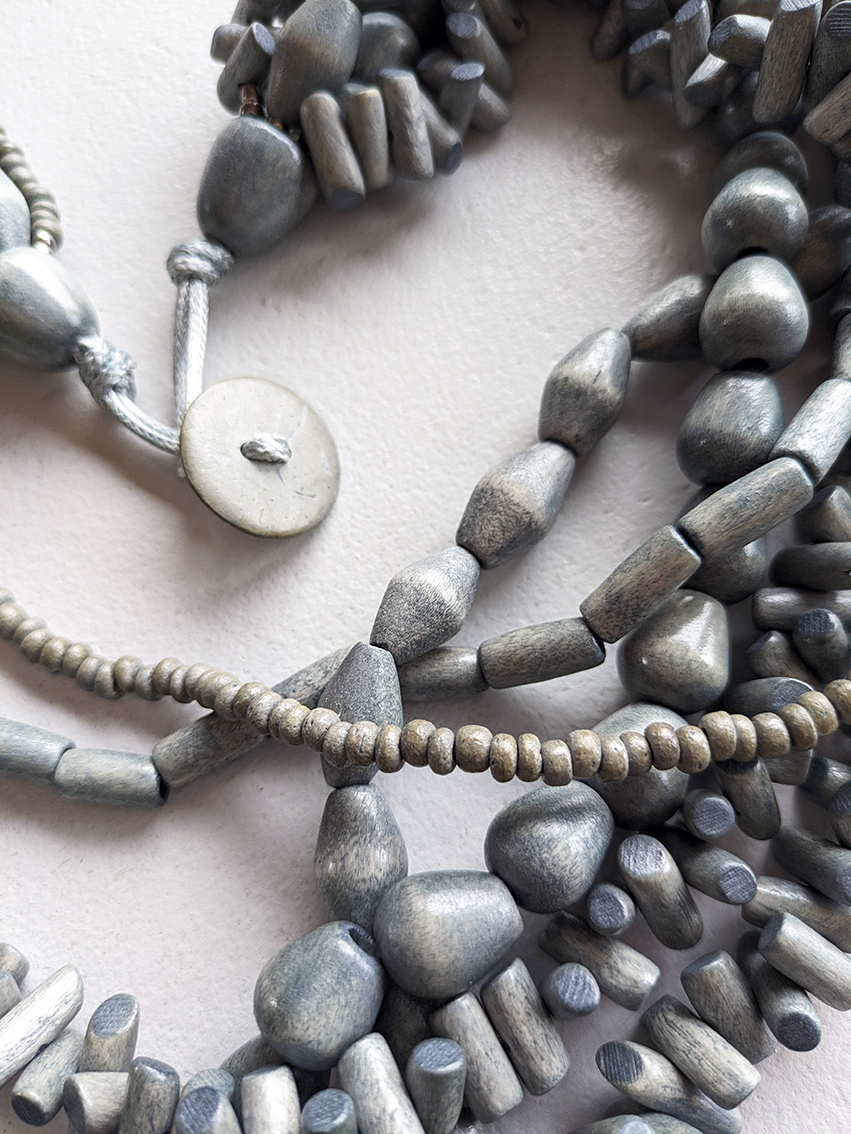 Gray wooden beads, cotton cord. Circumference inside = 50 cm. Unique piece. With buying this handmade necklace you are kindly supporting AMA WEAR 💛
